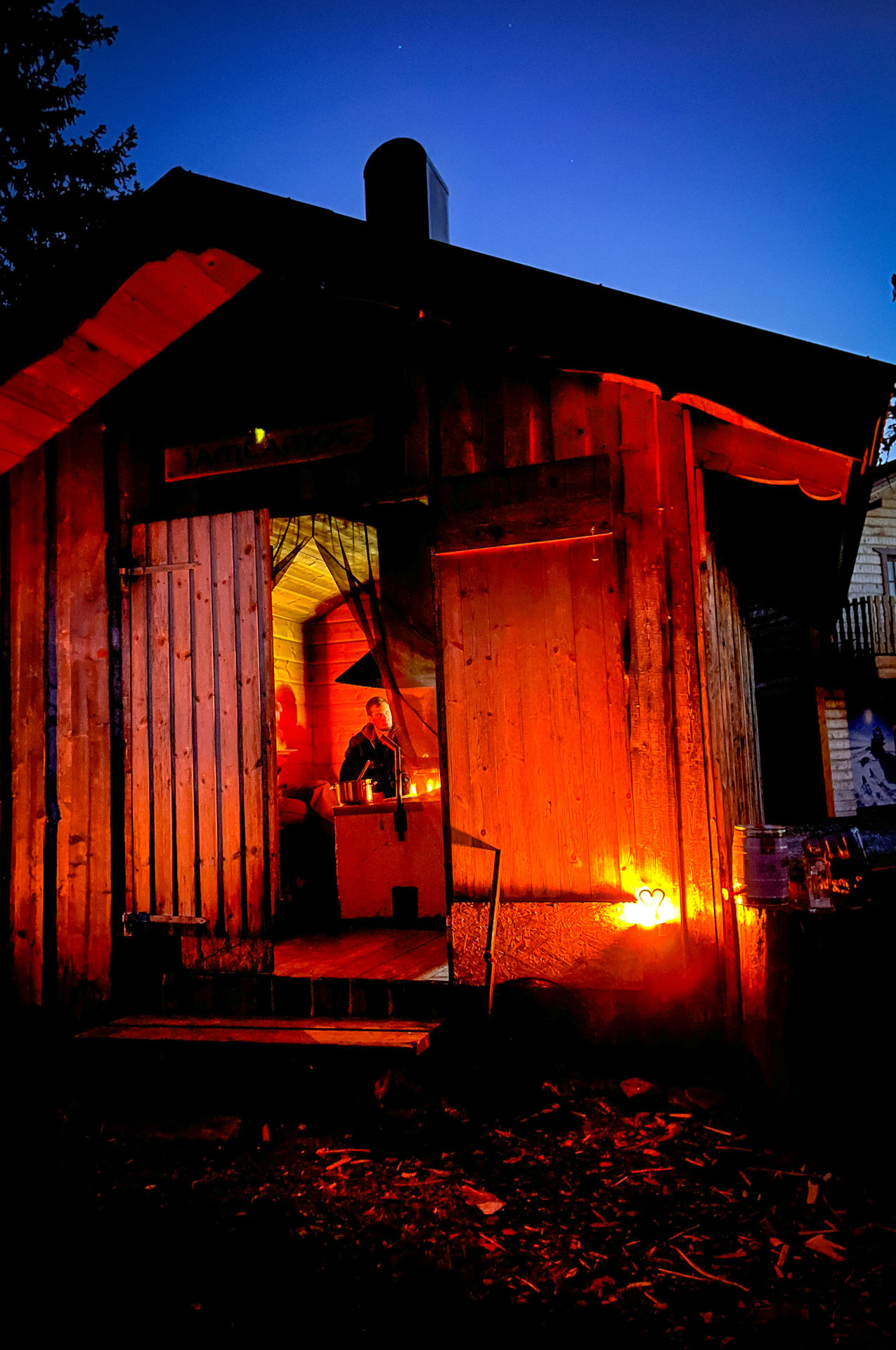 Zur blauen Stunde am wärmenden Feuer in der Grillhütte