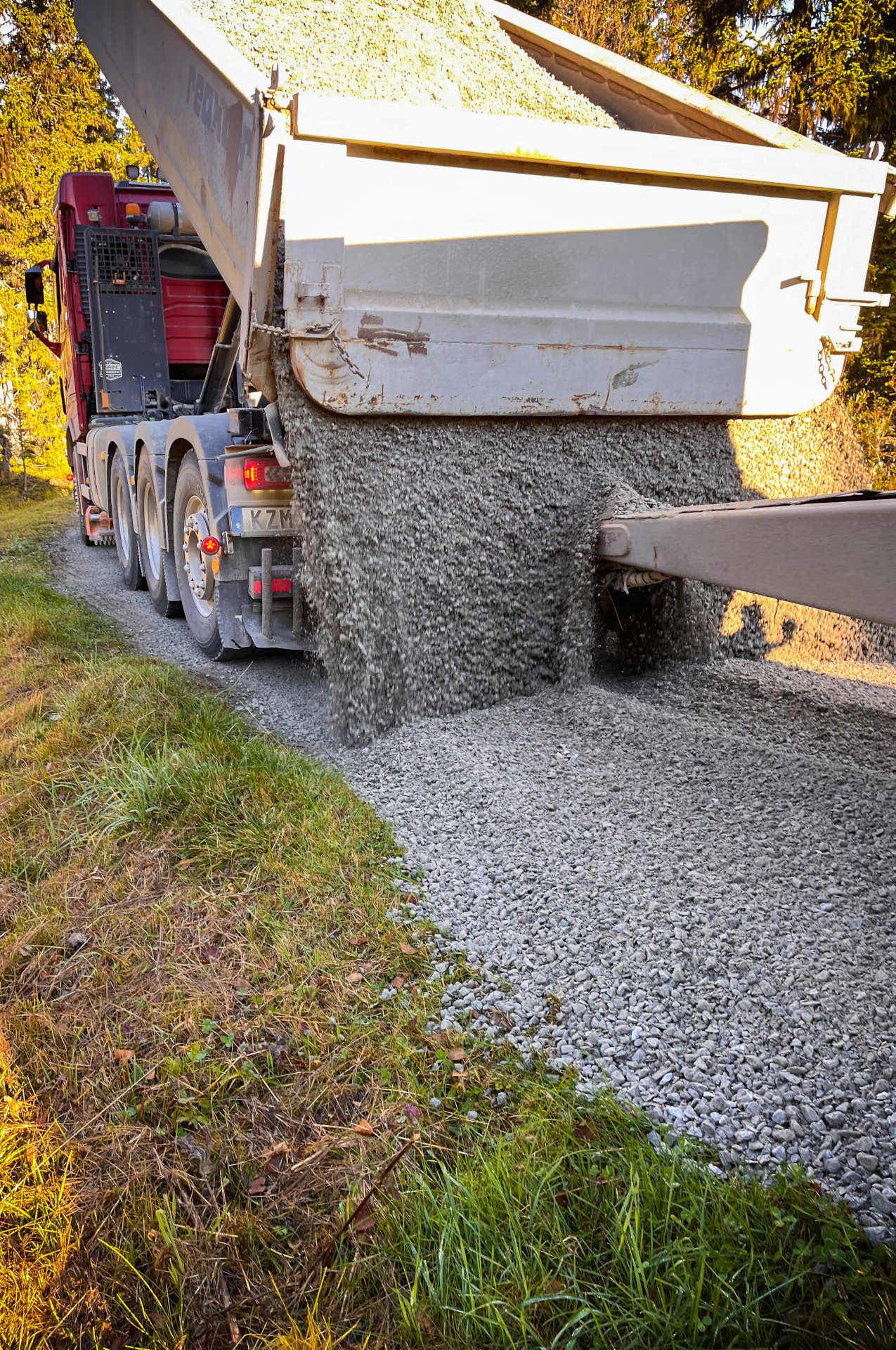 Die Einfahrt bekommt mit dem LKW neuen Kies im Herbst