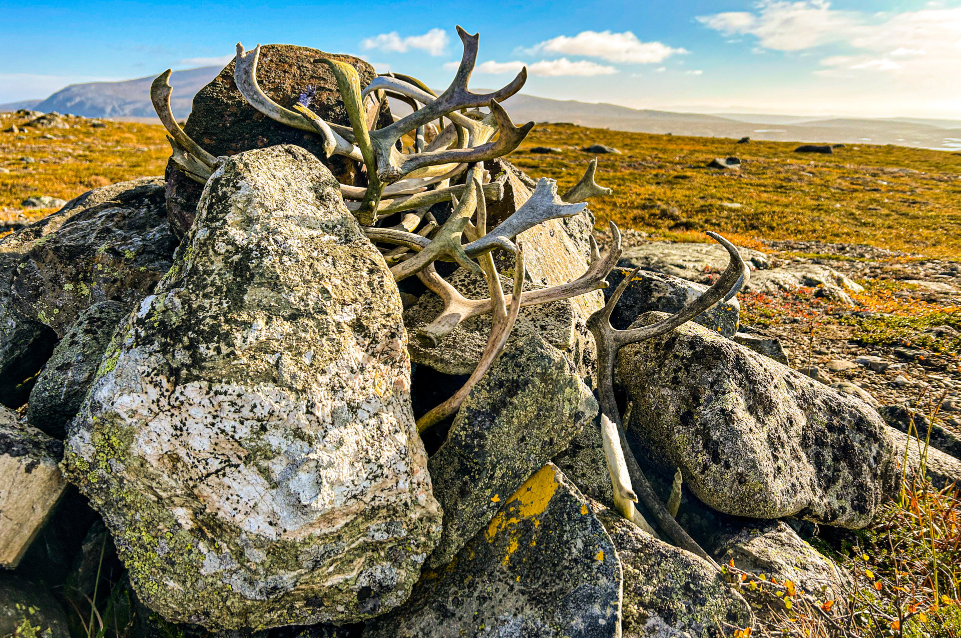 Viele kleine Rentiergeweihe markieren die Gipfelpyramide im Oviksfjäll