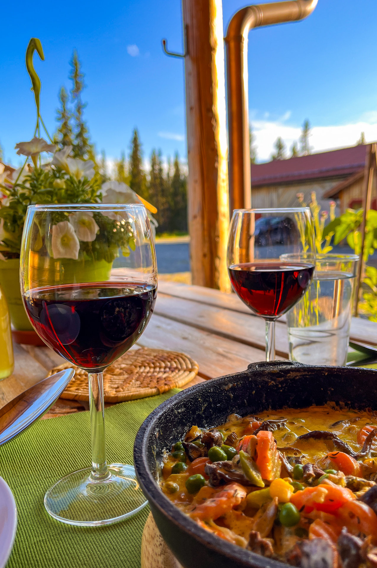 Zum Feierabend gibt es einen Wok mit einem Glas Rotwein