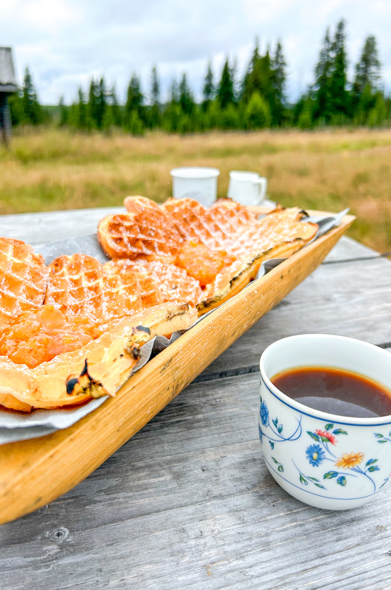 Kaffee (kokkaffe) und über dem Feuer gebackene Waffeln auf der Alm Långbodarna am Fäbodvägen