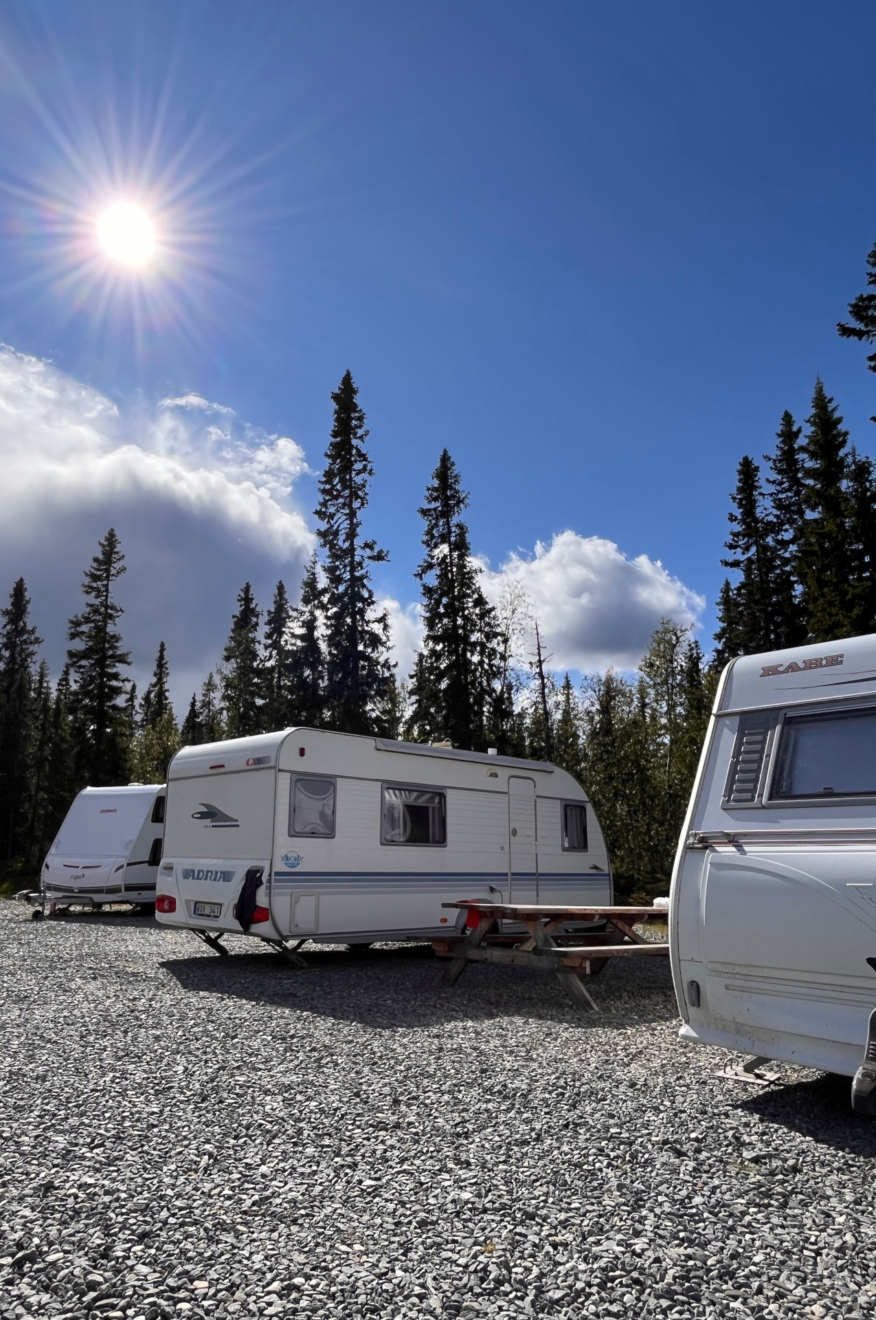 Gleich drei Wohnwagen nebeneinander auf dem Campingplatz in Schweden