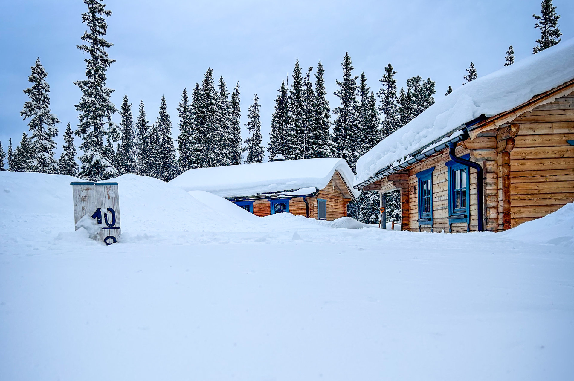 Stugor i Jämtland med mycket snö under vintern